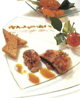 400 gr de foie gras de canard cru, 100 gr de macédoine de fruits confits, 6 tranches de pain d'épices, 10 cl de jus d'orange, 15 cl de jus de canard, 50 gr de sucre cristal, 50 gr de beurre,
