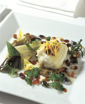 Parsemez l'assiette de ces fruits secs, pignons et amandes. Disposez les légumes, puis la lotte et ajoutez par petite pointe la sauce à la violette.